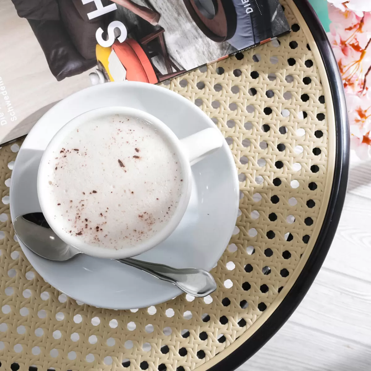Grâce à une fabrication étonnamment fidèle, le faux cappuccino se distingue à peine du vrai. Le cappuccino peut servir de substitut dans les vitrines, d’outil pédagogique pour les conseils nutritionnels, d’accessoire pour le cinéma, le théâtre, la télévision et les photographes culinaires ainsi que de substitut lors de salons et d’événements. Tasse avec soucoupe en porcelaine, avec imitation de boisson en cire gélifiée à s’y méprendre, prix à l’unité.