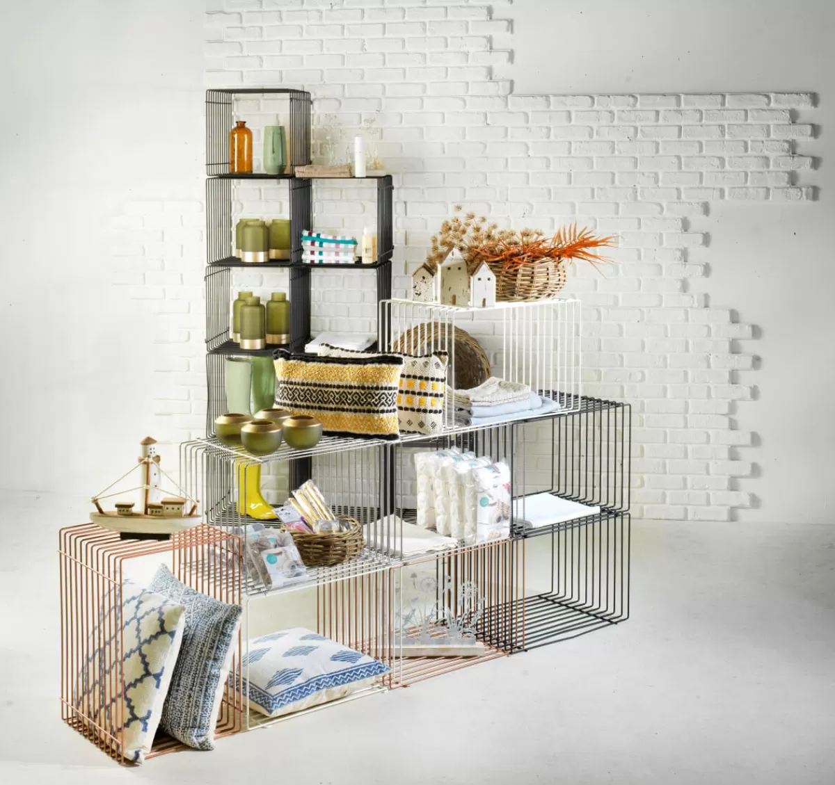 Cette étagère moderne est pourvue d’un nouveau style et offre des possibilités de présentation optimales. De conception modulaire, les cubes en treillis mettent parfaitement en valeur presque tous les produits et permettent un équipement flexible de la boutique. Dans un look industriel tendance en fer à béton Ø 6 mm, également appelé barre d’armature, revêtement en poudre de haute qualité.Prix/pce.