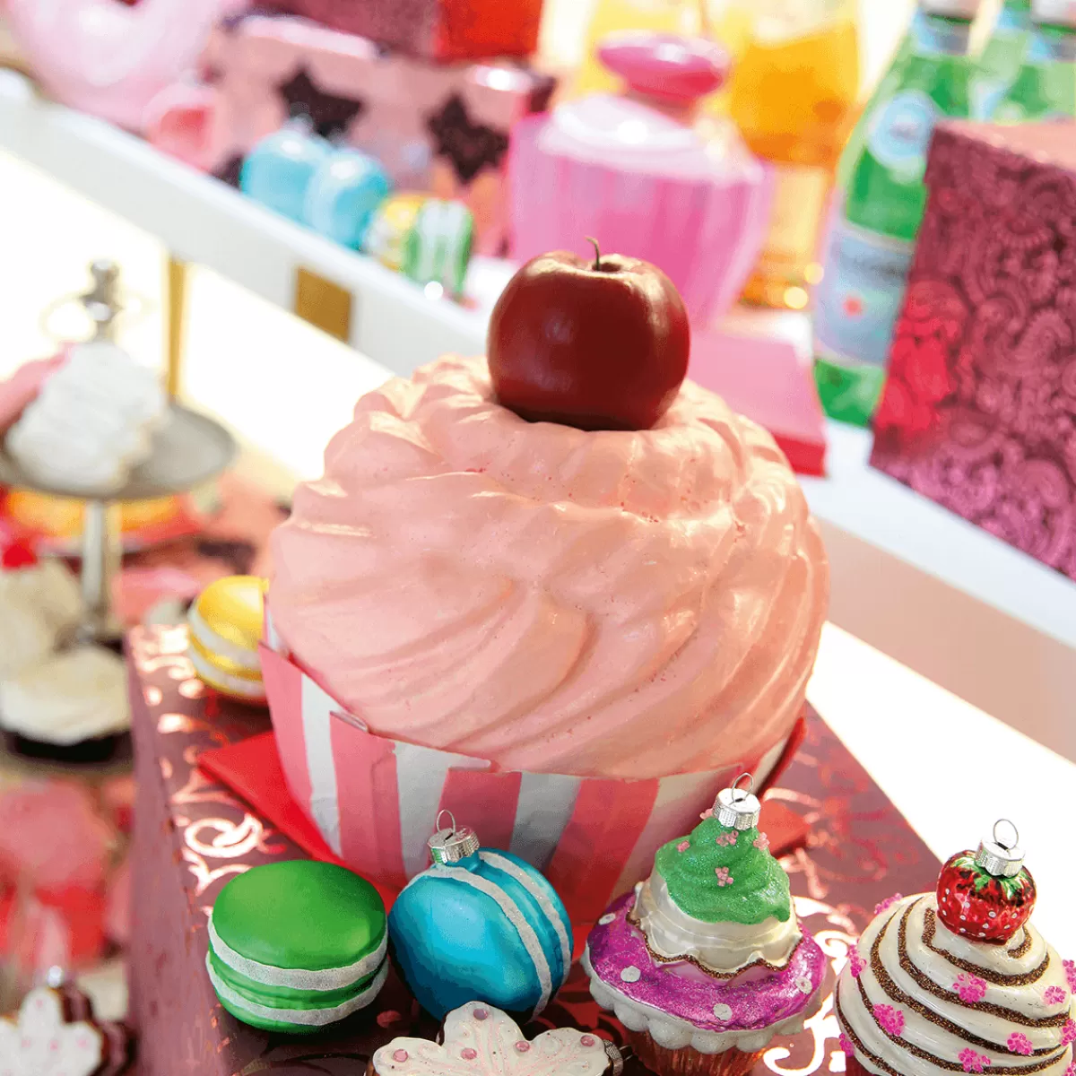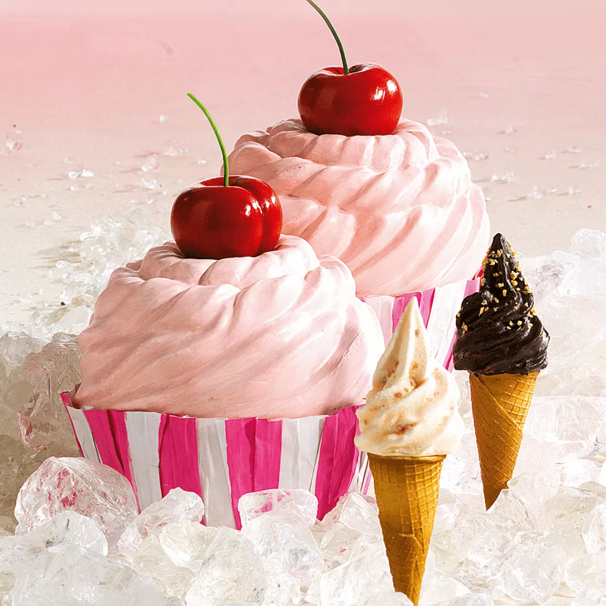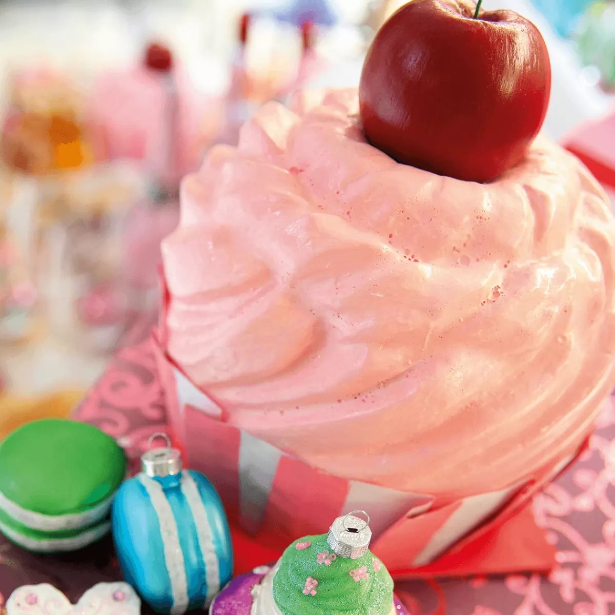 Faux aliments cupcake aux cerises en plastique de 20 cm de haute qualité, décorés d’une crème rose et d’une imitation de praline.