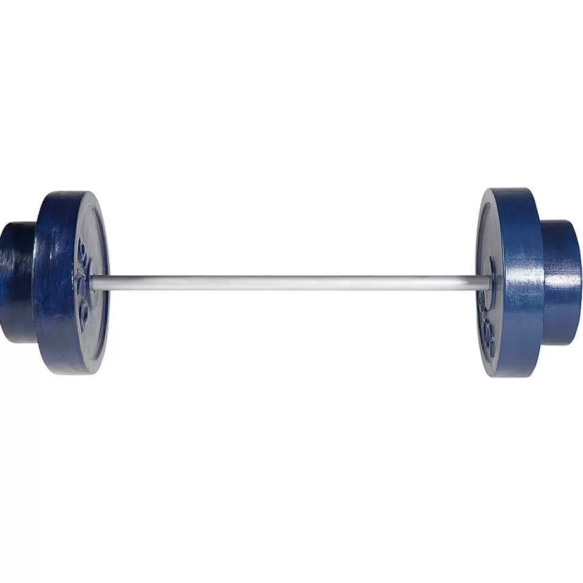 Lot d’haltères avec barre d’haltérophilie en bois verni argent et 4 disques d’haltères en mousse dure ép. 6 et 6,5 cm, prix/5 pces.