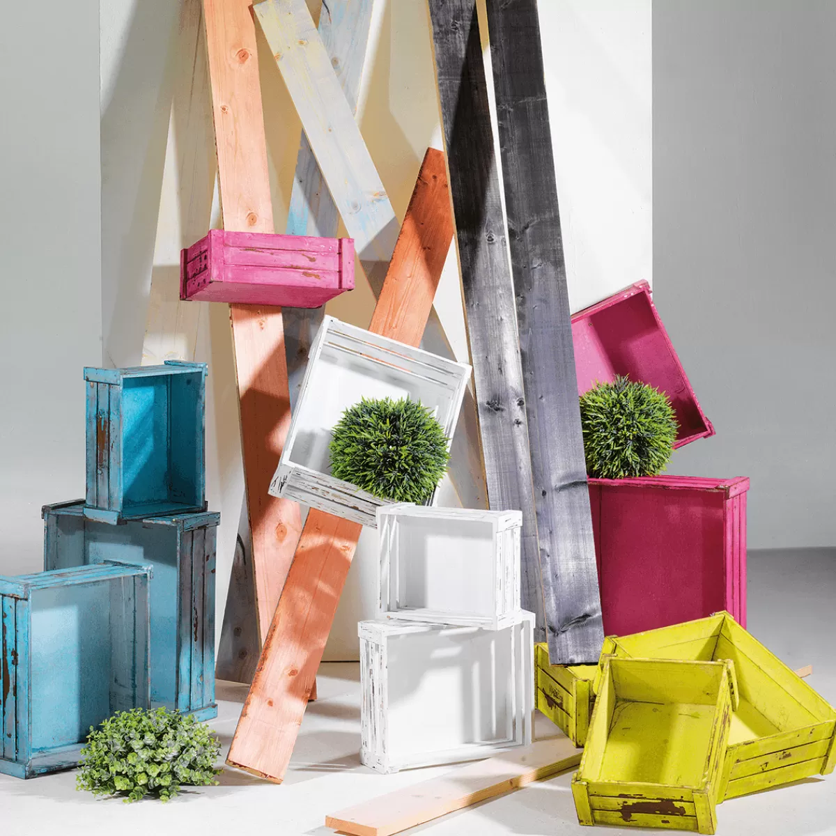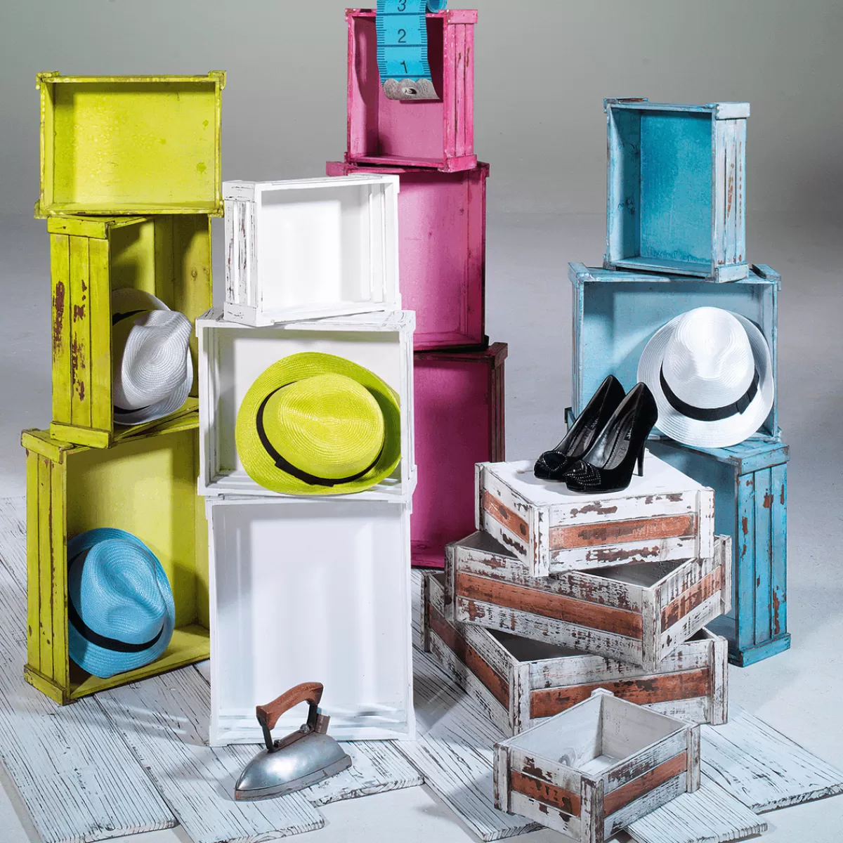 Caisses en bois décoratives avec vernis délibérément irrégulier dans le style shabby chic. Les caisses déco sont …