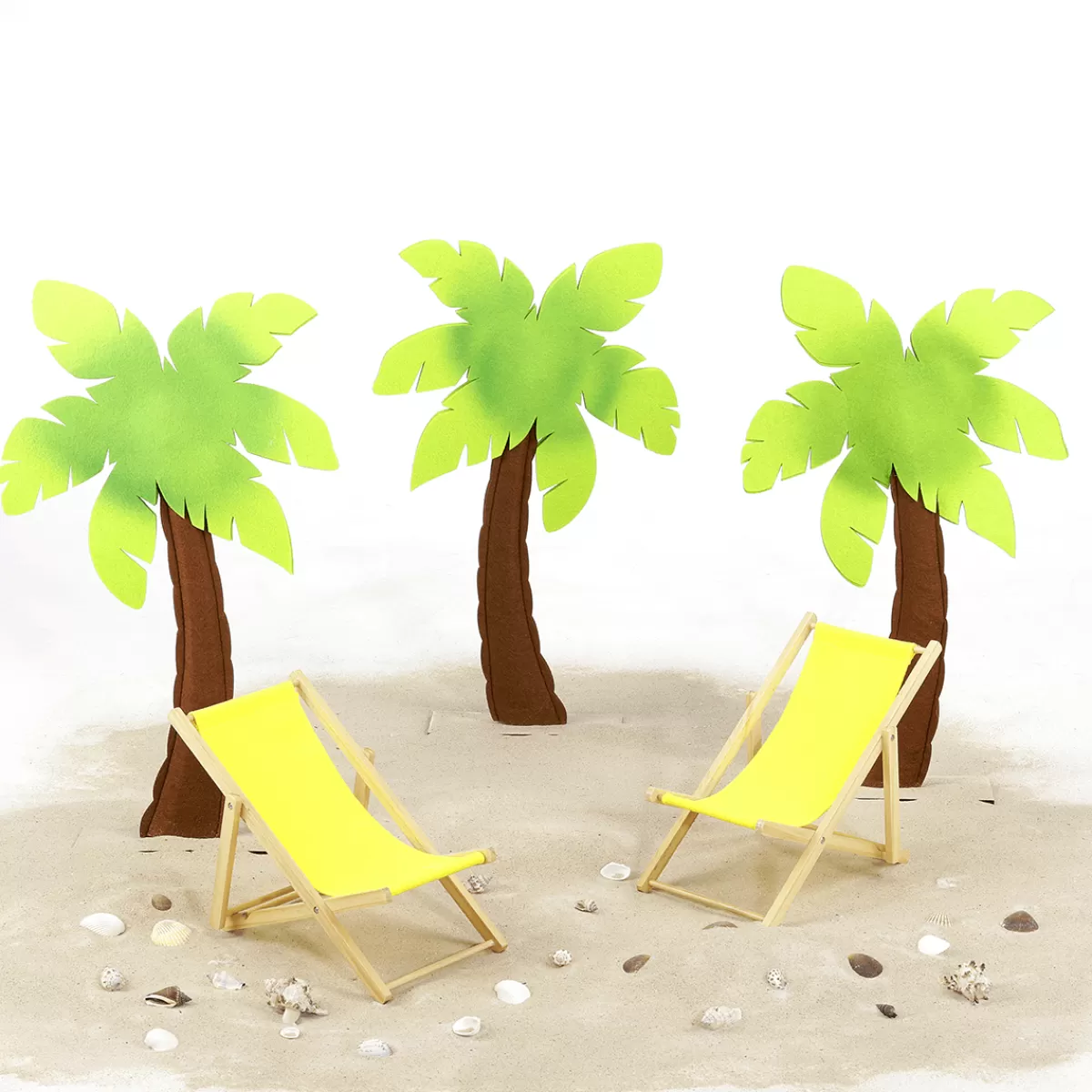 Deux chaises de plage décoratives pliables en bois naturel et tissu uni. Le petit ensemble de mini-fauteuils est parfait pour les décorations d’été, comme présentateur de lunettes de soleil ou comme support de téléphone portable pour le bureau.