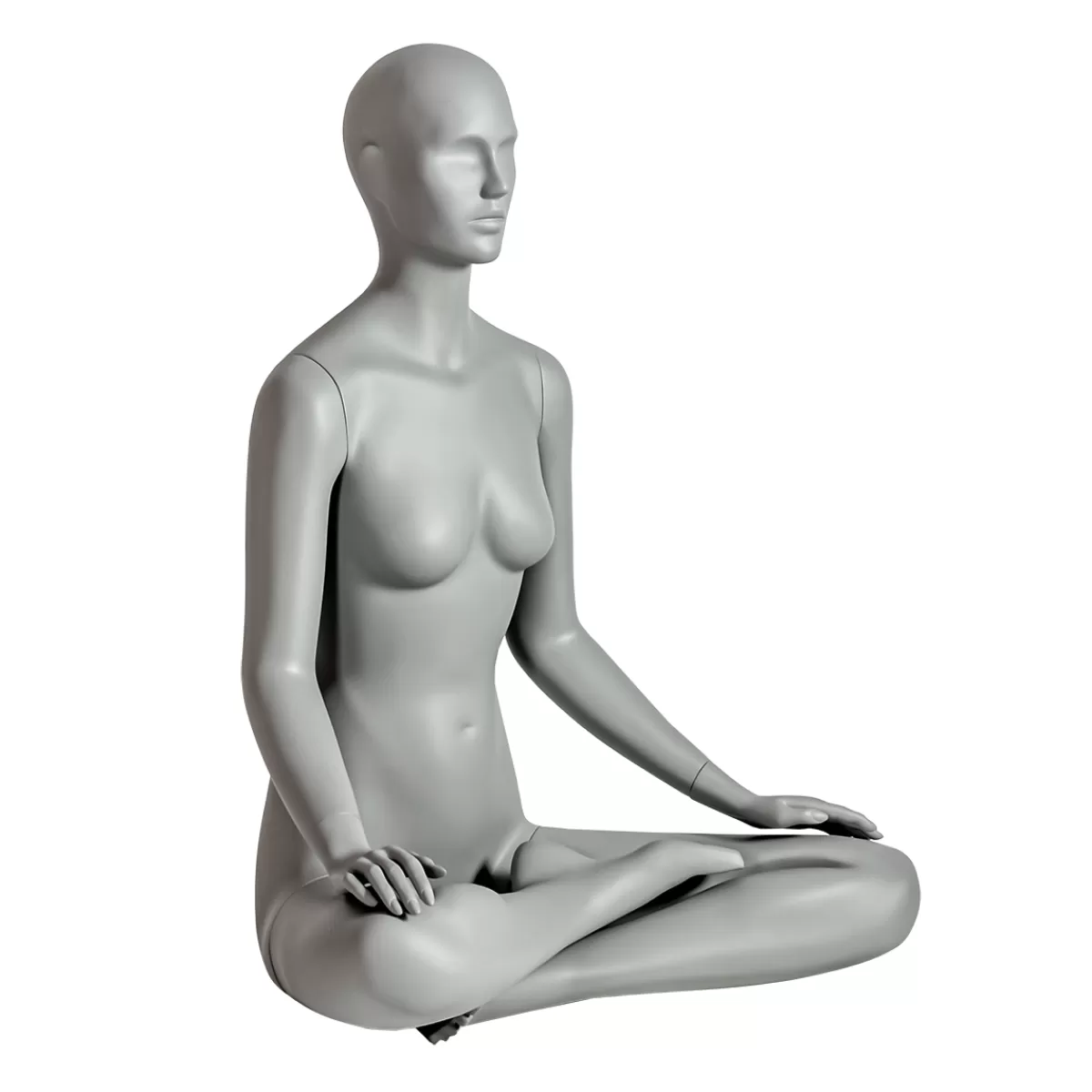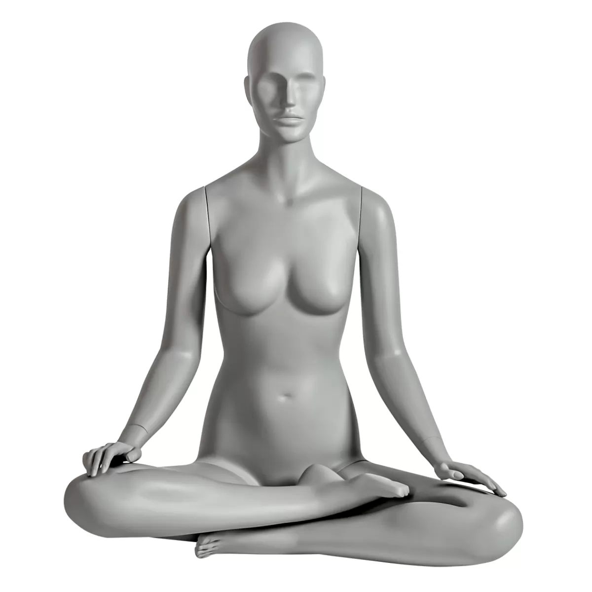 Ommm ! Entièrement absorbé par le moment présent et se reposant sur lui-même, notre mannequin femme se présente en position de yoga lotus. Puissant et en même temps détendu, méditatif et pourtant dynamique, notre mannequin sportif incarne un véritable accroche-regard pour la vitrine, le point de vente ou le stand d’exposition. Pour les commerçants de sport, c’est un must comme présentation décorative. Car le yoga ne peut pas être décrit, il faut le vivre. Ou le représenter de manière réaliste, comme nous l’avons fait avec ce mannequin assis. La dame détendue se repose en position verticale. Cette position est également connue sous le nom d’assise en tailleur. Ses mains sont posées sur ses jambes croisées et tournées vers l’extérieur.