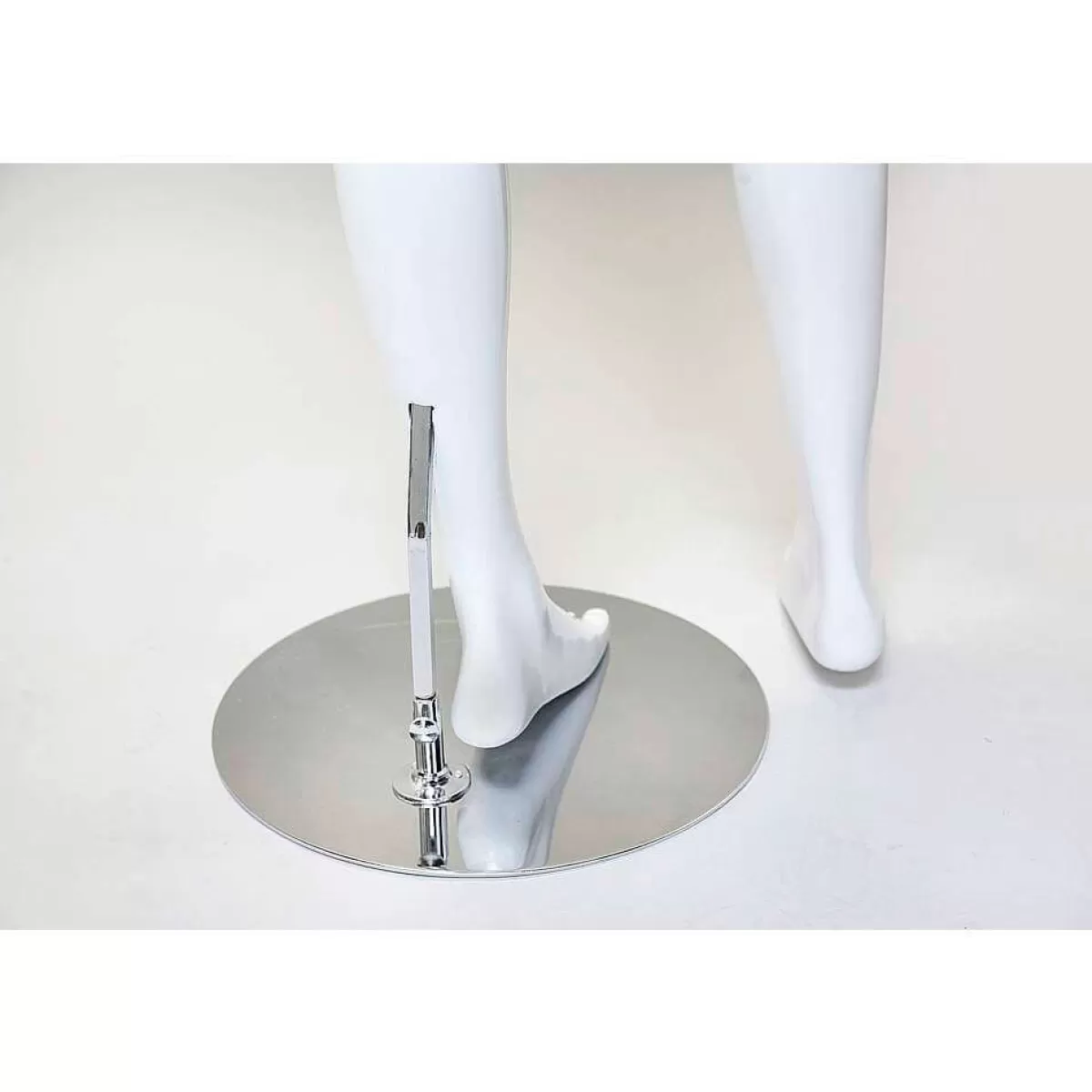 Mannequin de vitrine féminin, sans visage, ultra-brillant, avec silhouette mince seyante dans une position élégante. Ce mannequin a un corps 3D en fibre de verre d’un blanc pur. Incl. tige pour mollet et plaque métallique chromée. Prix/pce.