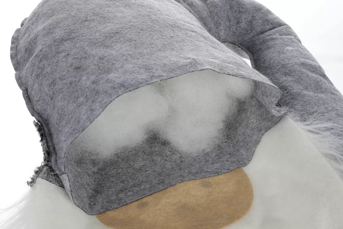 Le Père Noël en textile est adapté par l’existant, avec une ouverture rembourrée en coton pour être drapé de façon décorative sur des bâtons de bois ou des troncs de bouleau. Il trouve ainsi sa place dans les compositions florales, les entrées de maison ou les vitrines de magasins.