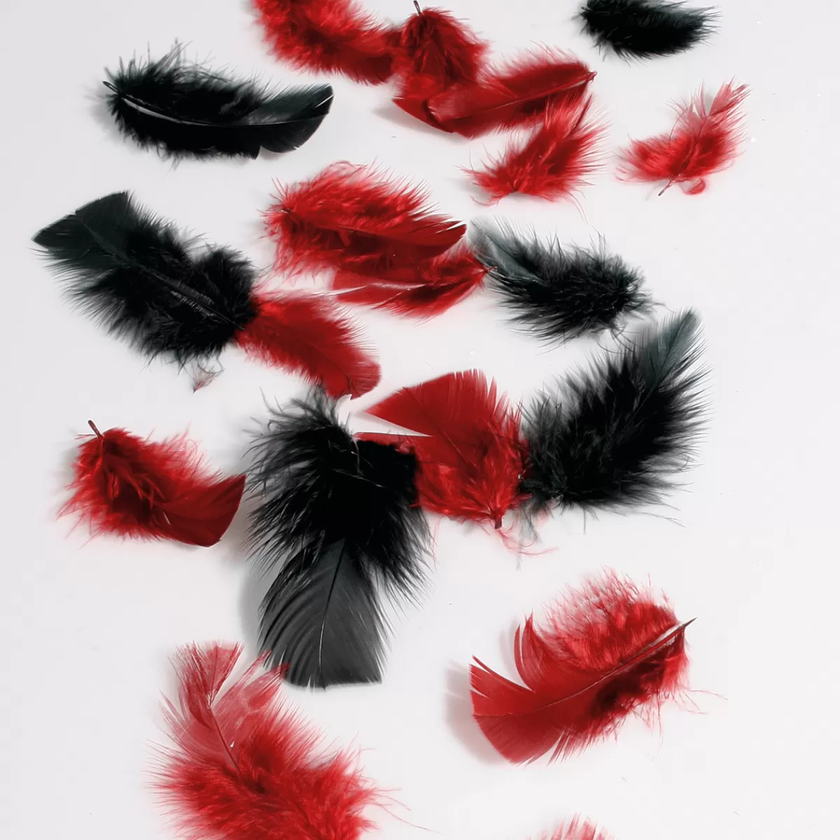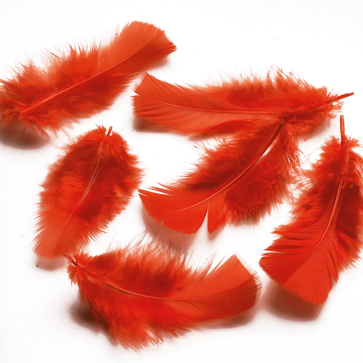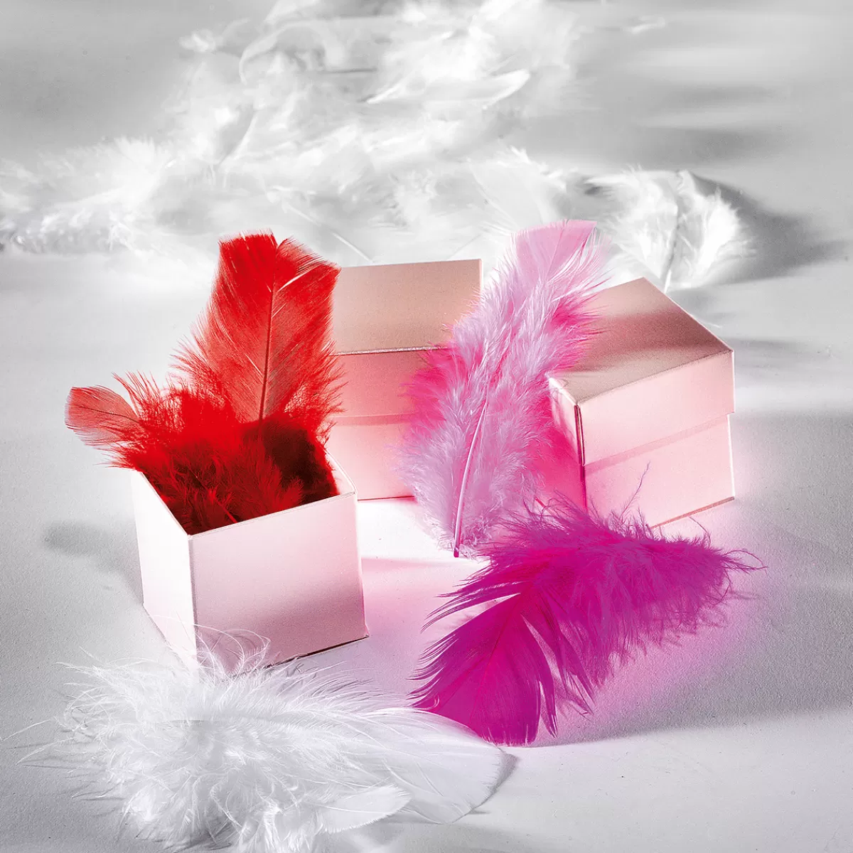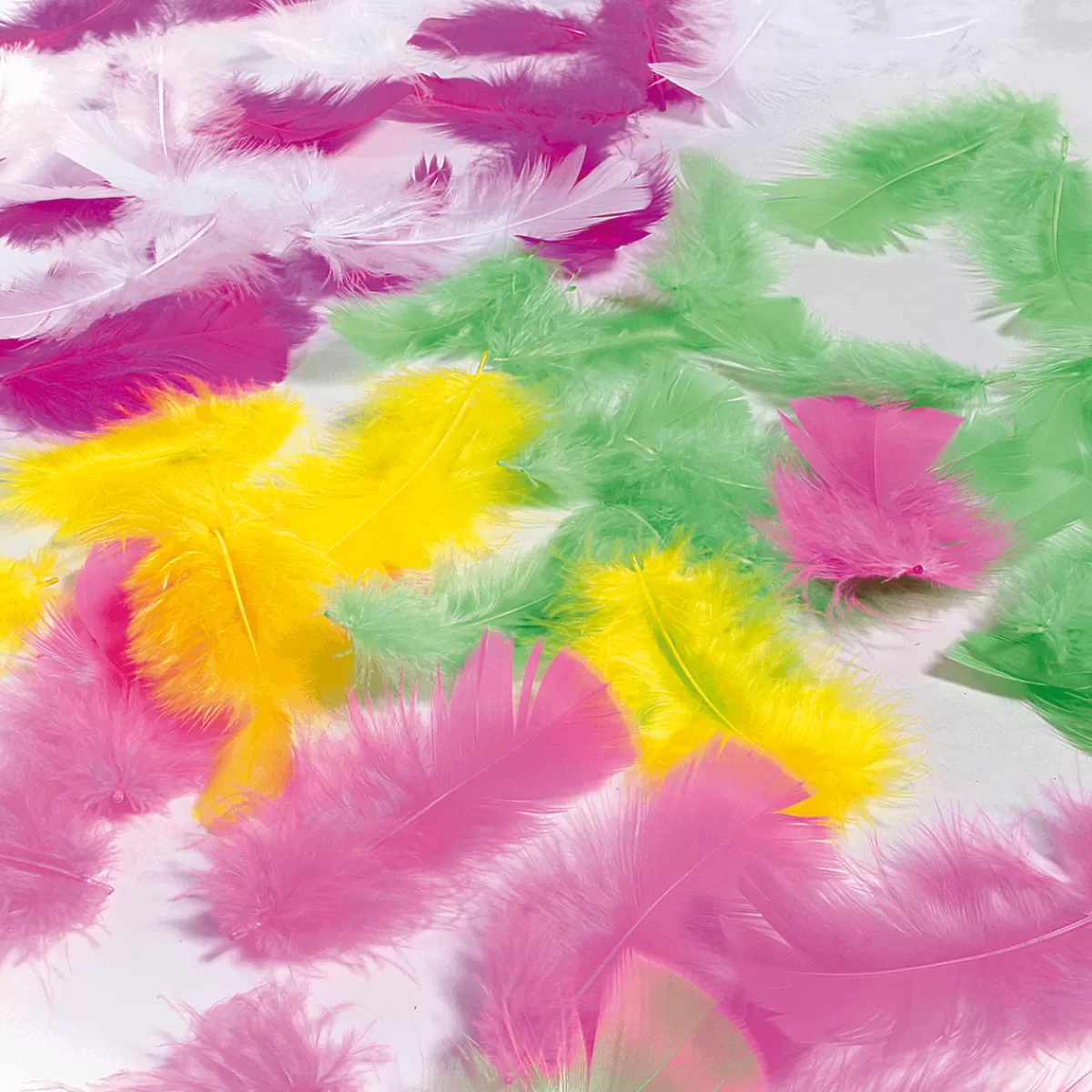 plumes naturelles colorées pour la déco de mariage, pour déco de table, artisanat, emballage, dans le domaine des fleurs et des costumes pour le carnaval et le Mardi Gras. Les pièges à rêve, masques et bijoux peuvent être décorés facilement. long. 6 – 8 cm, env. 150 pces. Prix/paquet.