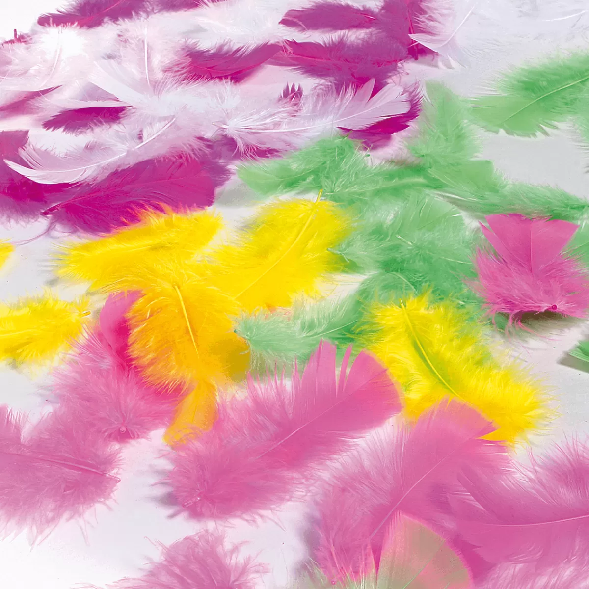plumes naturelles colorées pour la déco de mariage, pour déco de table, artisanat, emballage, dans le domaine des fleurs et des costumes pour le carnaval et le Mardi Gras. Les pièges à rêve, masques et bijoux peuvent être décorés facilement. long. 6 – 8 cm, env. 150 pces. Prix/paquet.