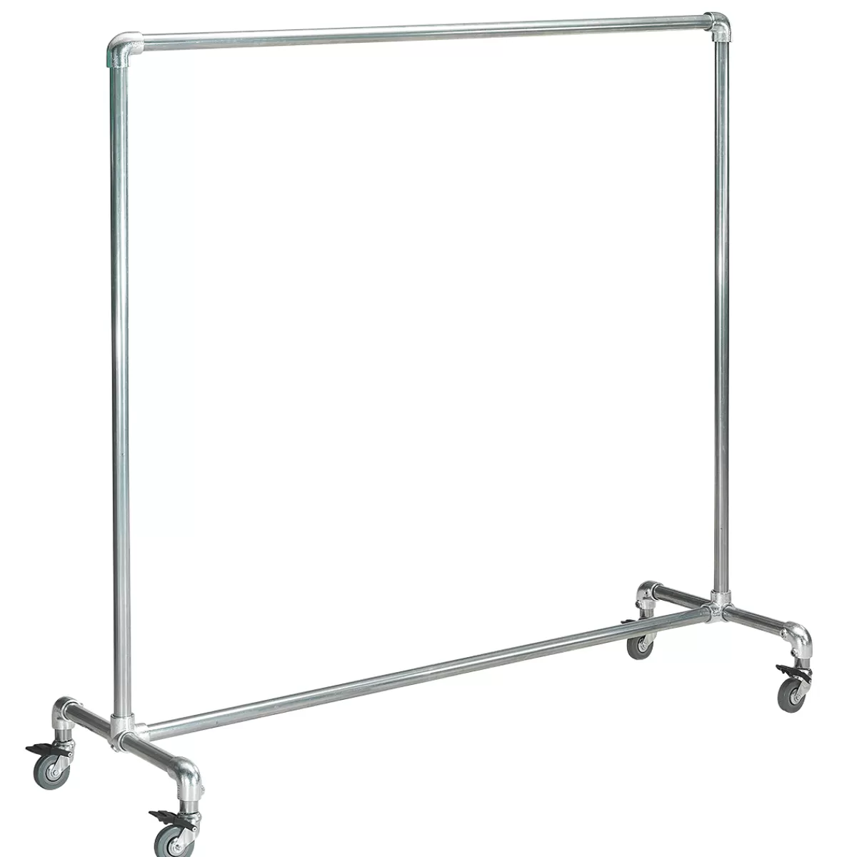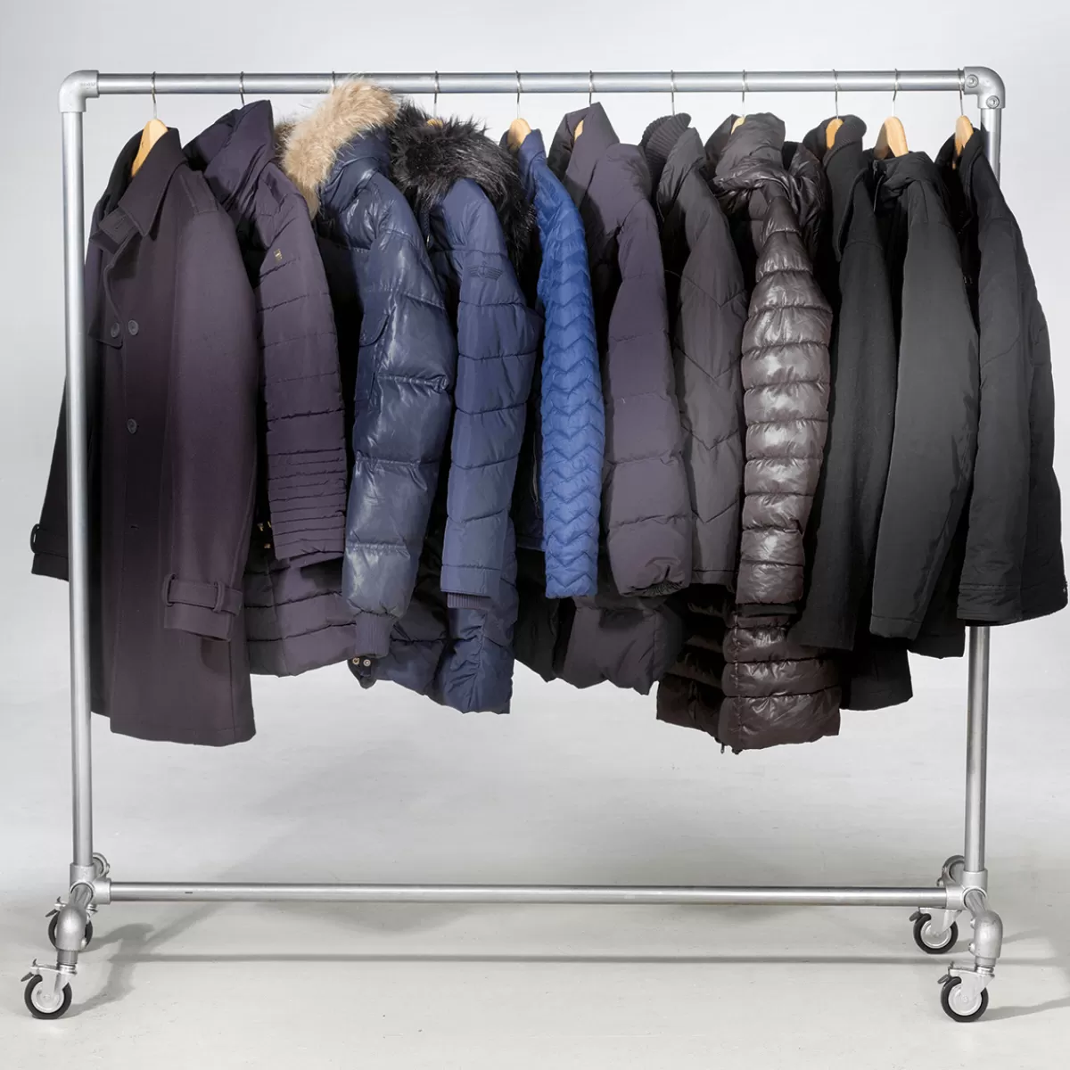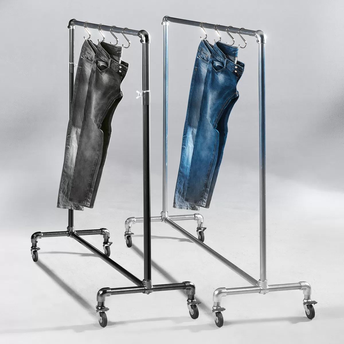 Exposez vos vêtements ! L’aspect industriel de ce stand de laminage donne à chaque pièce un caractère de loft moderne. Pour la présentation des marchandises et l’aménagement des espaces de vente, les stands de prêt-à-porter offrent d’excellentes possibilités de présenter les vêtements sans plis et de façon claire en fonction des tailles. Ils sont également indispensables pour un usage intensif pendant le transport, l’exposition et le stockage. La construction robuste garantit une grande stabilité et permet d’exposer des vêtements lourds. Pour l’extérieur, le stand est équipé de très grandes roulettes pivotantes en caoutchouc de 8 cm ; deux d’entre elles sont freinées en diagonale, de sorte qu’il se tient solidement et sûrement, même sur une légère pente. Construction métallique en finition mate galvanisée, avec tige de suspension en tube rond de 3,5 cm Ø.