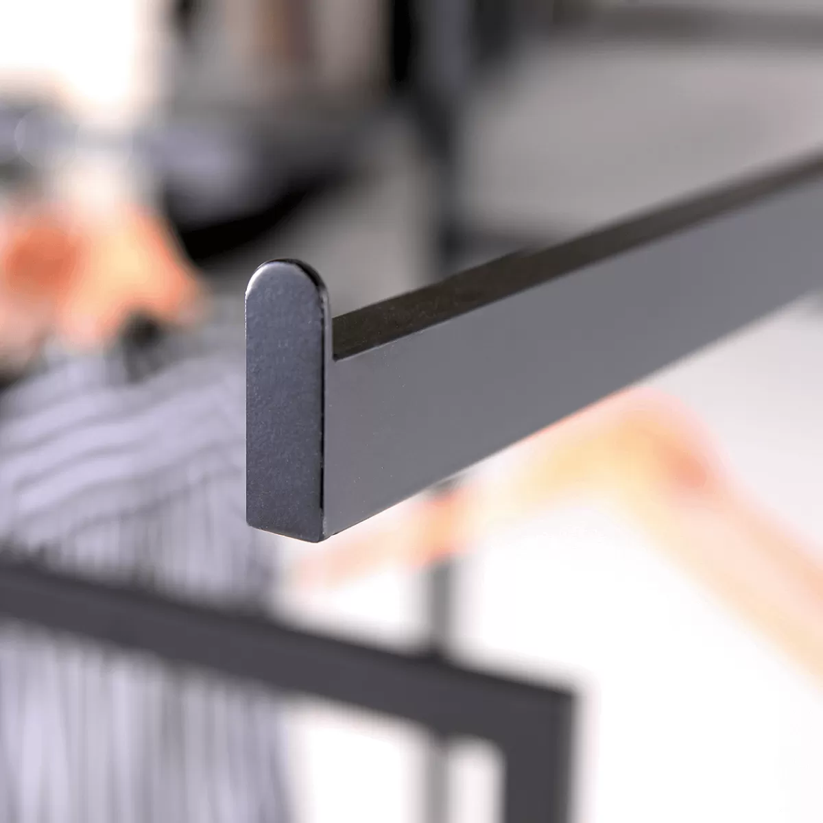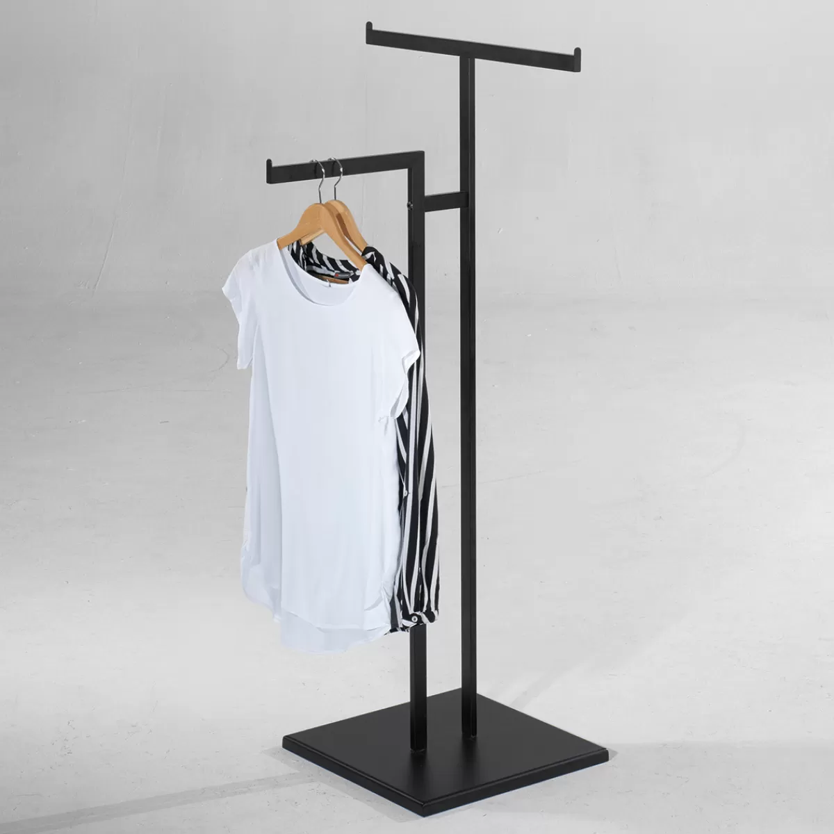 Avec les éléments combinables de manière flexible de notre série NOVUS, vous pouvez concevoir des agencements de magasin modernes et fonctionnels. Ce portant en T de haute qualité est idéal pour la présentation de textiles et d’accessoires. Les bras de suspension avec goupille de délimitation empêchent les objets suspendus de glisser. Haut. respective de 118,5 et 138 cm et longueur de bras de 35 et 65 cm. Le cadre carré de 20 mm est complètement soudé et donc très stable. plaque de sol à monter soi-même (45 x 45 cm) à l’aide de la clé hexagonale fournie. Le revêtement en poudre de haute qualité produit l’aspect mat, empêche la rouille et la corrosion et donne à ce portant textile durabilité et résistance.