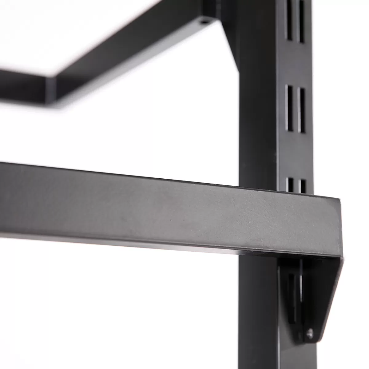 Avec les éléments combinables de manière flexible de notre série NOVUS, vous pouvez concevoir des agencements de magasin modernes et fonctionnels. Notre système de suspension multifonctionnel avec rangement offre une solution élégante pour le centre de la pièce ; de nombreux petits articles occupent les plus petits espaces : 2 cintres à hauteur réglable sur 10 niveaux pour la présentation de côté et 2 bras supplémentaires pouvant être fixés de manière variable pour la présentation de face permettant de présenter différents textiles sans produire un effet surchargé. La tablette en métal perforé d’une larg. de 25 cm offre un espace suffisant pour exposer des chaussures ou des sacs à main assortis. Une plaque de sol supplémentaire empêche le salissement des vêtements. La structure en métal avec cadre carré de 20 mm est revêtue de poudre de haute qualité, ce qui rend ce support textile durable et robuste. Veuillez noter que le montage est à effectuer soi-même. Prix/pce.