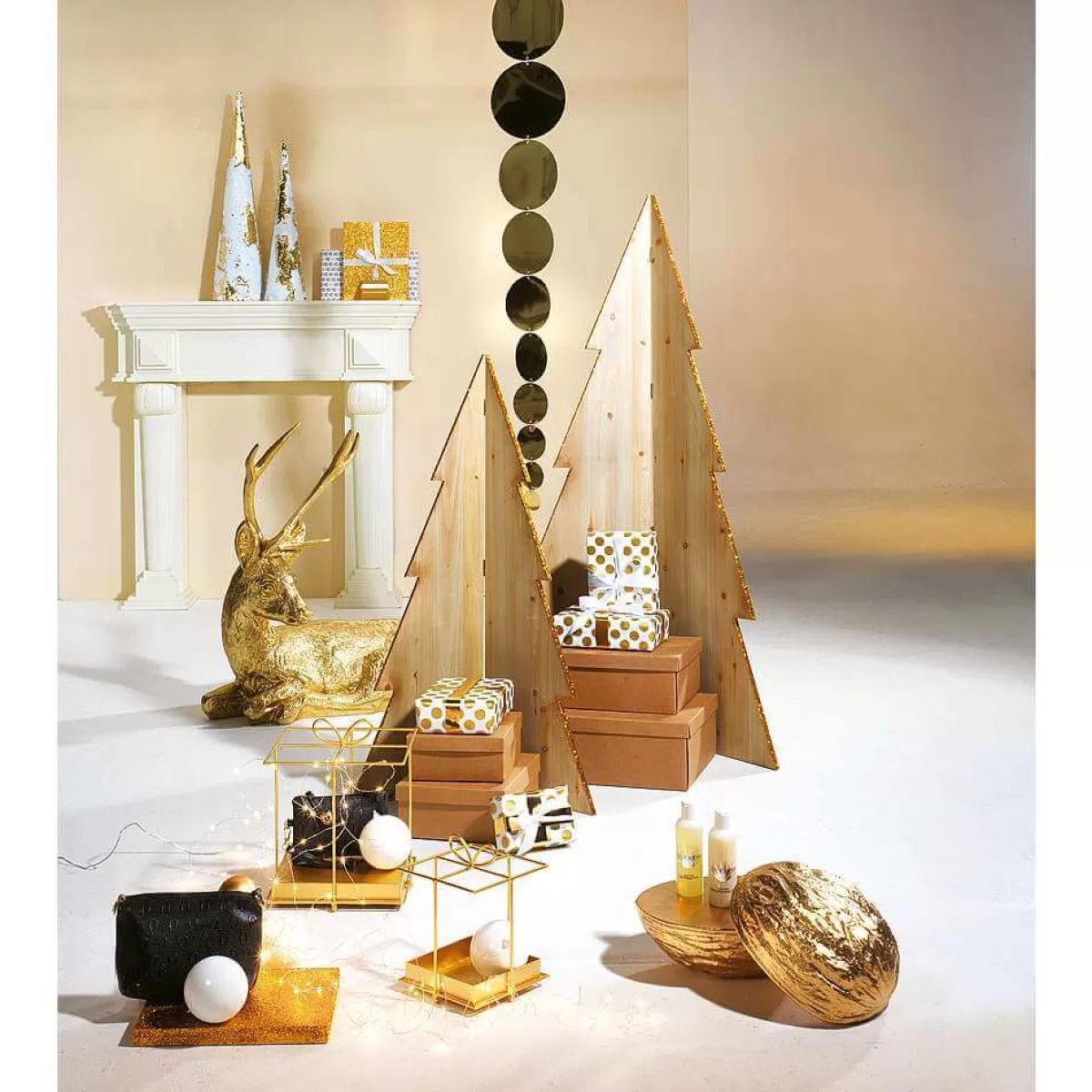 Ce présentoir en arbre déco au design clair et réduit s’adapte au style chic comme décontracté. La sculpture en arbre non conventionnelle est faite de panneaux en MDF, pelliculés d’un côté avec un aspect bois ; les bords sont décorés de paillettes couleur or festives. Le sapin en bois convient comme décoration de Noël pour l’entrée, dans la vitrine ou dans la salle d’attente. Placé dans un coin ou parallèlement au mur, il offre un excellent jeu d’ombres en combinaison avec une source de lumière. Peut être replié après utilisation pour économiser de l’espace. Prix/pce.
