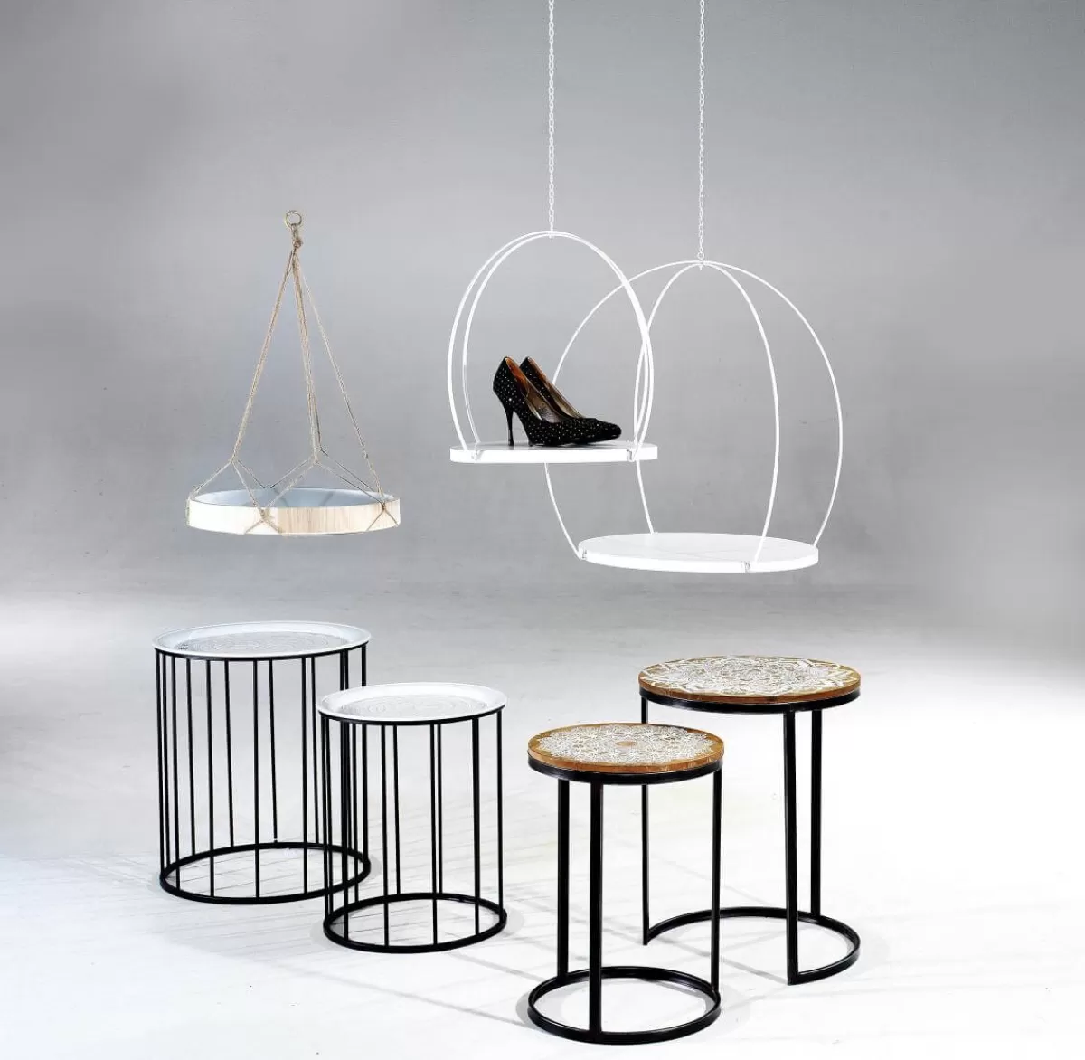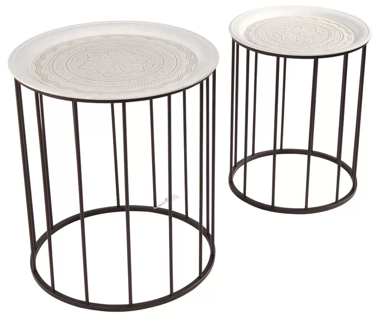 Tables d’appoint avec tablette amovible en métal avec motif en relief de style vintage. Structure ronde en métal poudré. Approprié pour la tendance déco actuelle de l’été Bohème ou Ibiza. Prix/lot de 2 47×55 + 38x47cm.
