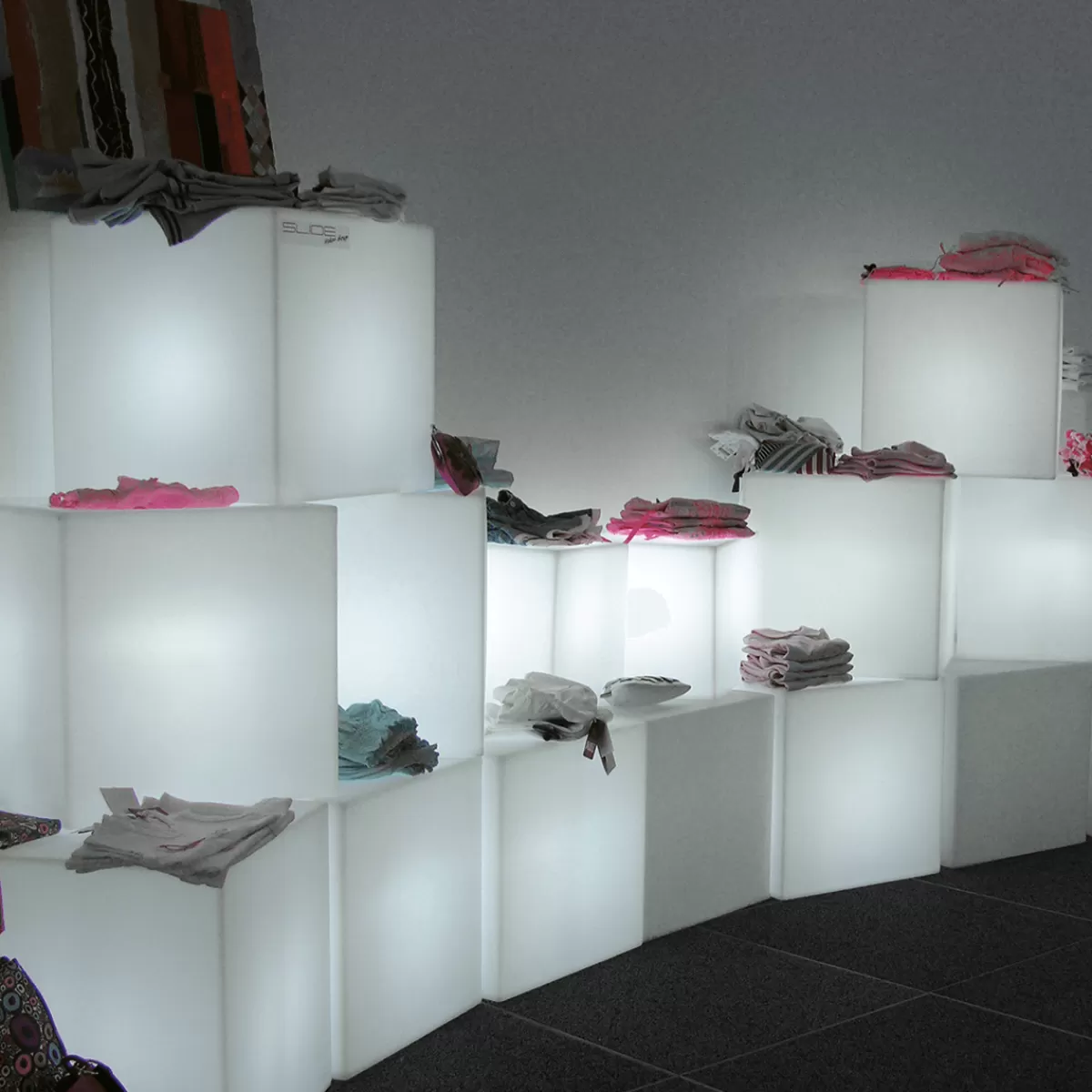 Qu’il soit empilé comme siège, comme table d’appoint ou pour éclairer les murs, ce cube lumineux intemporel a diverses applications et peut être combiné à loisir. En tant qu’accessoire d’int. pour la maison, il dégage une agréable atmosphère lounge et procure un éclairage élégant. Des lampes colorées à économie d’énergie créent des accents supplémentaires. Fabriqué en polyéthylène robuste et facile à nettoyer. Livré sans ampoule. Remarque : un adaptateur est nécessaire pour l’application en Suisse.Vous le trouverez dans notre assortiment sous le numéro d’article 432.160.00.Prix/pce.