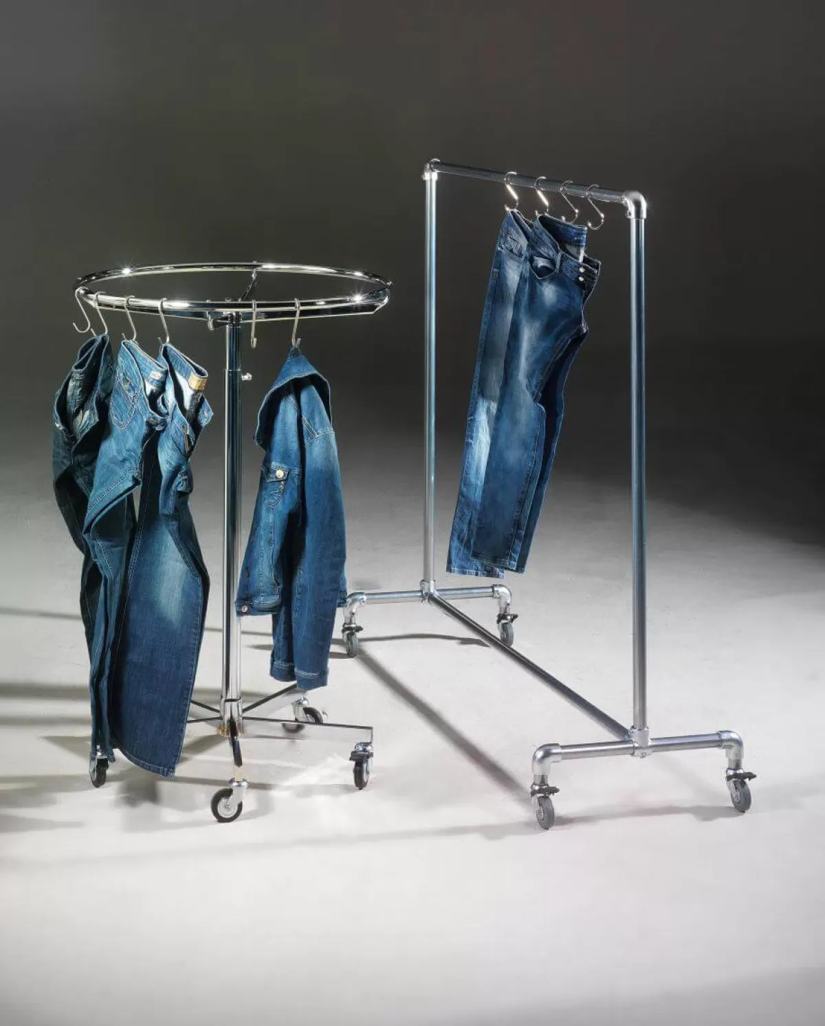 Présentoir de vente classique pour la présentation de votre collection de vêtements. Ce présentoir circulaire robuste est solide et stable, ce qui permet de suspendre des vêtements lourds sans problème. Le support circulaire rotatif est réglable par encliquetage, construction robuste en métal chromé, pied à 5 pieds avec roulettes pivotantes en caoutchouc 50 mm. Prix/pce.