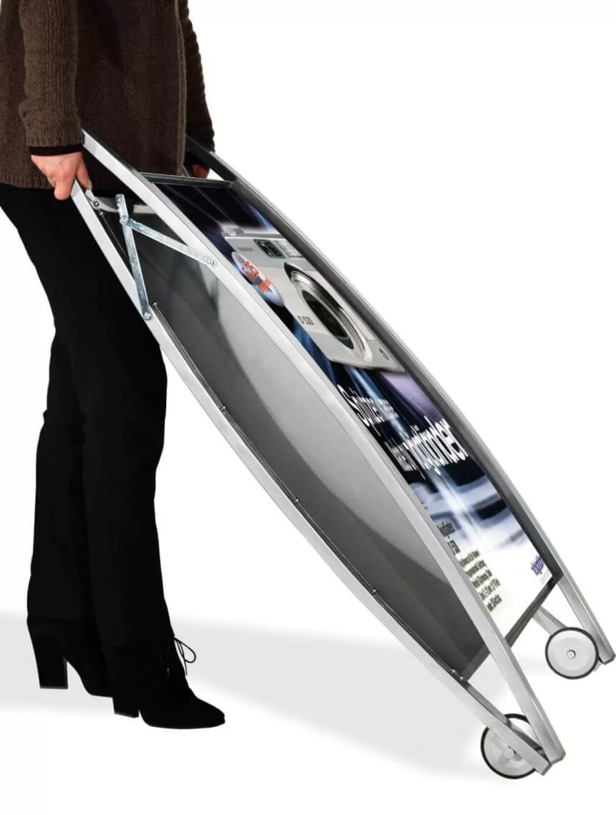 double face, stable et résistant aux intempéries, design moderne, acier poudré, feuille résistante aux UV av. bande aimantée qui adhère au panneau arrière, remplacement de l’affiche par sac d’affiche aimanté, av. roulettes pour un déplacement aisé du support, prix/pce