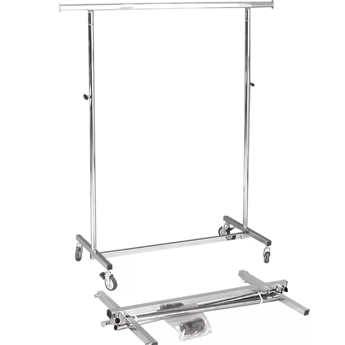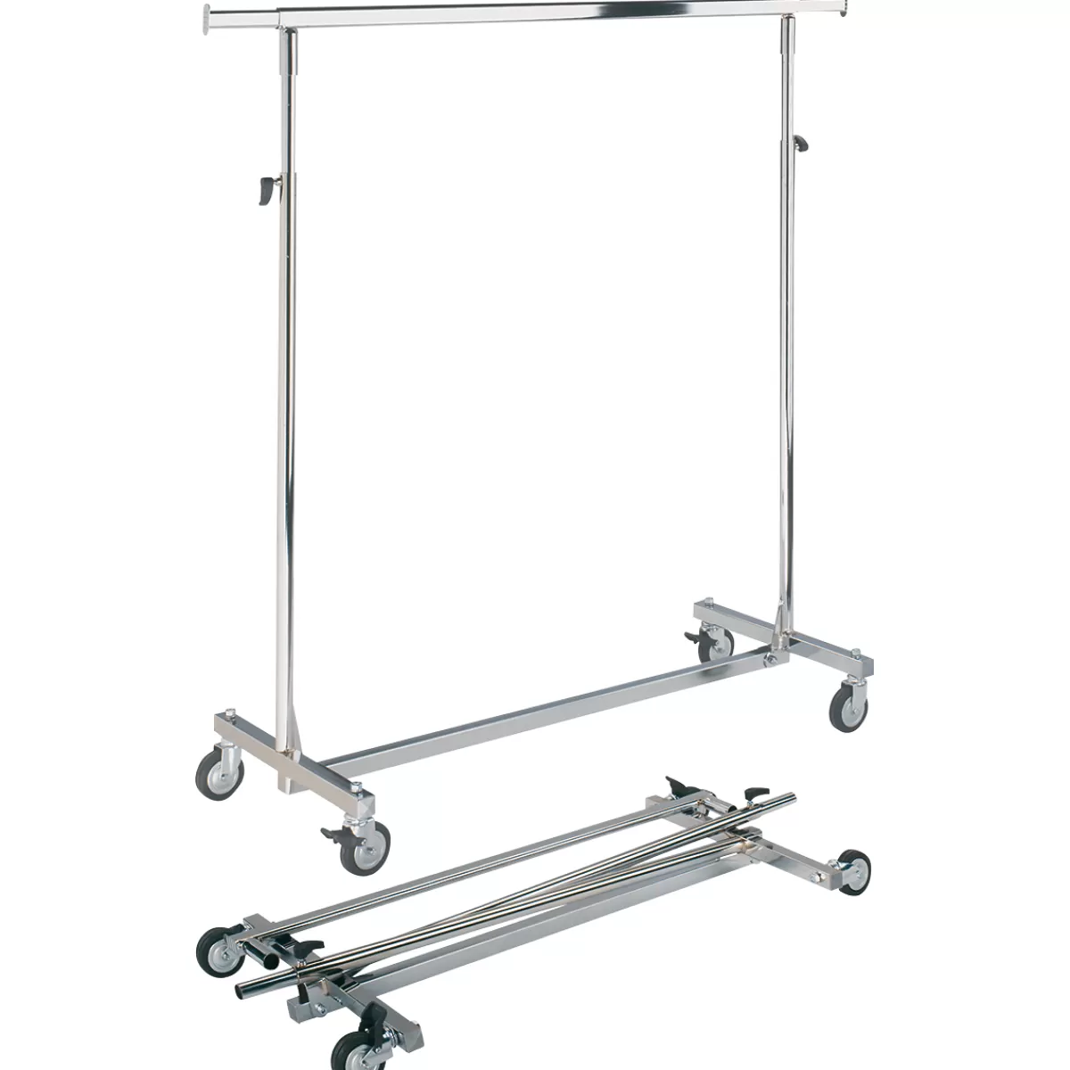 Portant à vêtements pratique pour un rangement et un transport des vêtements peu encombrant. La tringle à vêtements réglable en hauteur individuellement permet de ranger les vêtements longs et les peignoirs sans saleté ni plis. Quatre roulettes en caoutchouc de 80 mm faciles à utiliser le rendent mobile et souple d’utilisation, les freins de stationnement offrent la sécurité nécessaire. La tringle à vêtements peut être étendue des deux côtés de 35 cm chaque pour avoir plus d’espace. Après utilisation, la tringle à vêtements peut être pliée et rangée sans encombrer. Construction robuste en métal chromé.