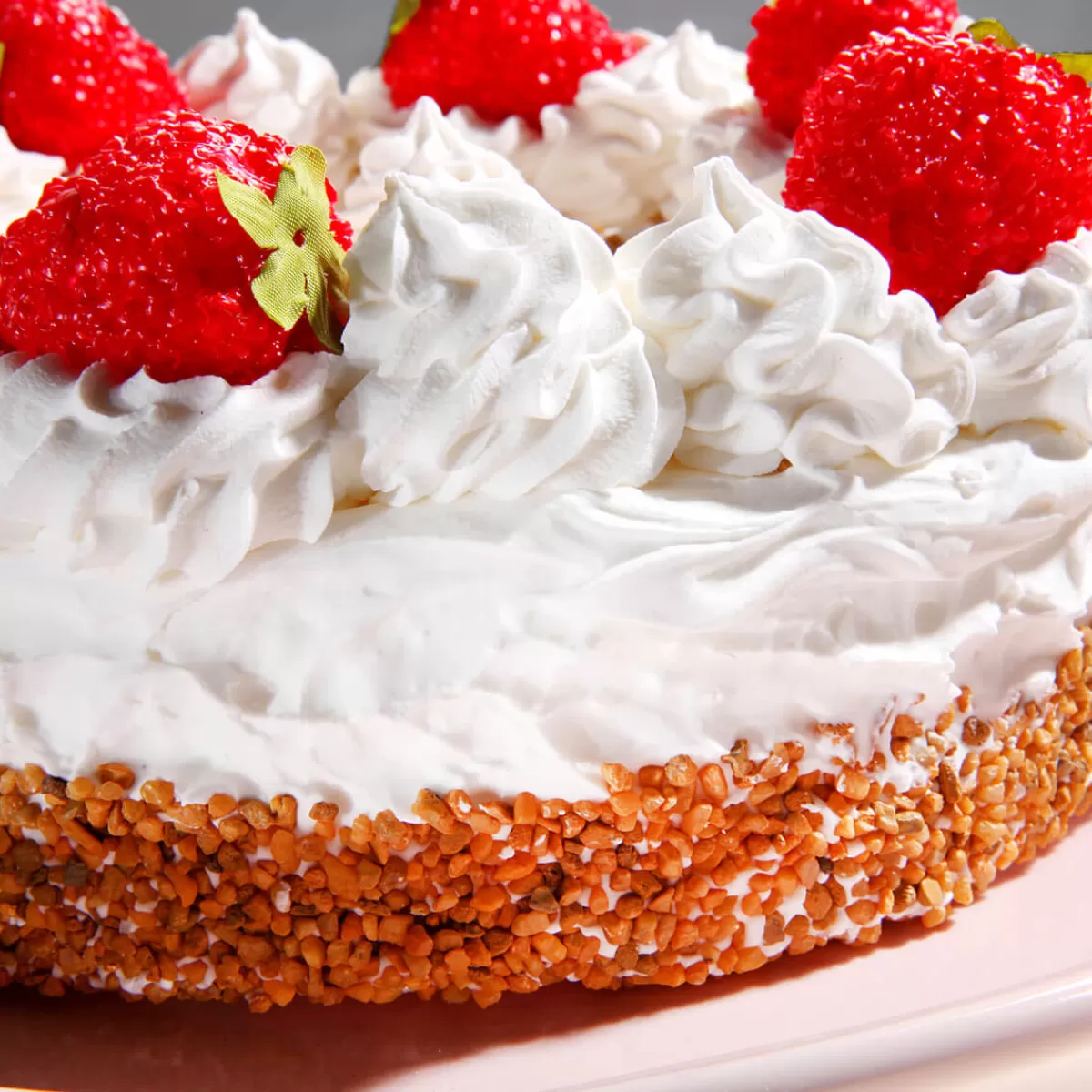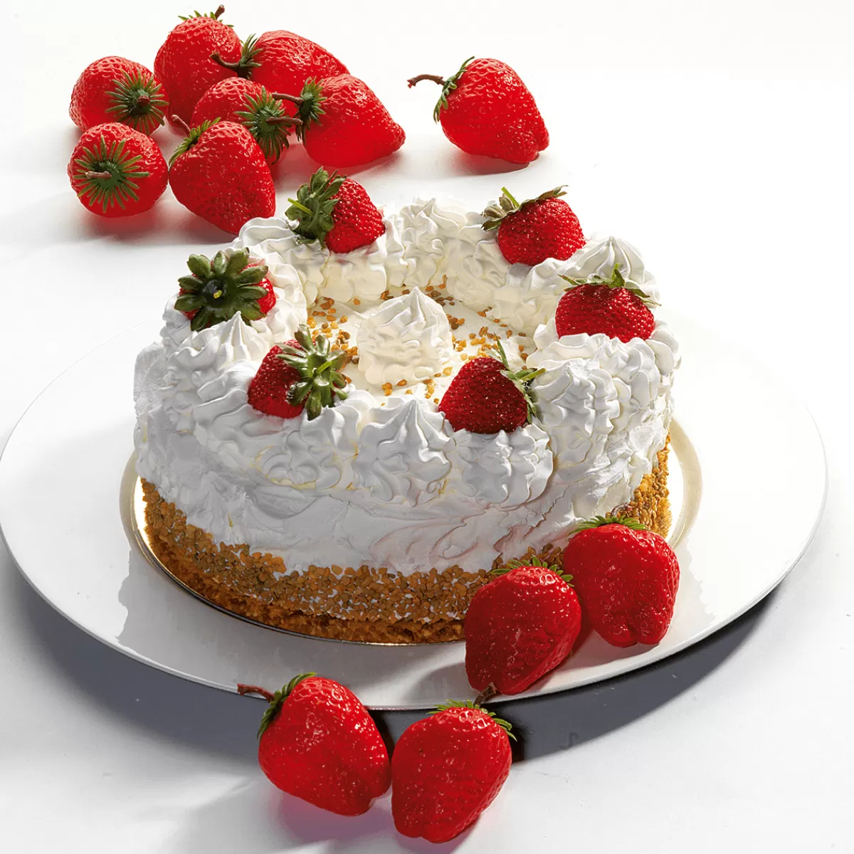 Tarte à la crème et aux fraises en plastique de haute qualité et travaillée avec un grand souci du détail, avec 6 fraises artificielles sur des capuchons de crème fouettée.